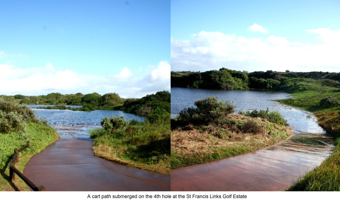 But Links staff aren’t the only ones wading through water. The St Francis Bay Golf course has been collecting water too. The coursedam overflowed onto St Francis Drive flooding it and a couple of driveways alongside . Golf has been cancelled on both courses or the next few days.