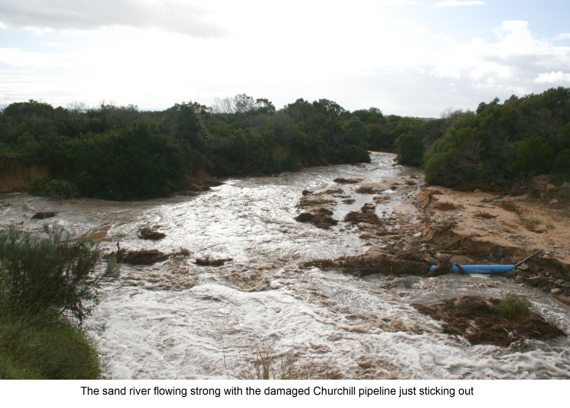 Large natural dams that have been building up with water further up the sand river pose a threat to St Francis Bay. Should they breach, it could cause flash flooding. The Churchill pipeline supplying water to St Francis Bay has been damaged where it crosses the Sand River so will need repairing.