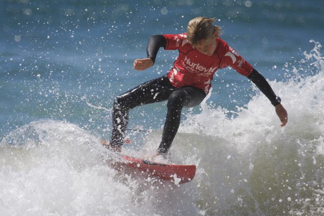 After the blistering Jarred Veldhuis heat, the next person to take to water and impress was young Matt McGillivray , an U15 team member from EP. Matt has a reputation forged from charging hard at big Supertubes in Jeffrey’s Bay, and also knows how to whip it around in the small stuff, as displayed yesterday. Matt picked up one running right-hander on which he managed to smash 6 big forehand turns, riding it all the way to the shallows for a score of 7.25. Everyone’s ears pricked up when they heard this score, as this put Matt in the picture for the trip toAustralia. With a heat total of 14.25 to catch up to Jarred Veldhuis, another 7.25 would see Matt in the lead.