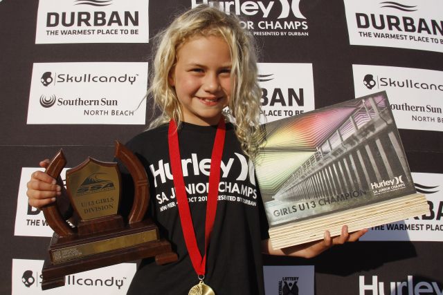 Tahra Uren(PE,EP) won the U15 girls title of the Hurley SA Junior Champs.¹s New Pier today. Tahra beat Chanelle Botha (SKZN), Courney Ellish (SKZN) and Jade Mets (KZN) respectively in the closely contested final to take the win.