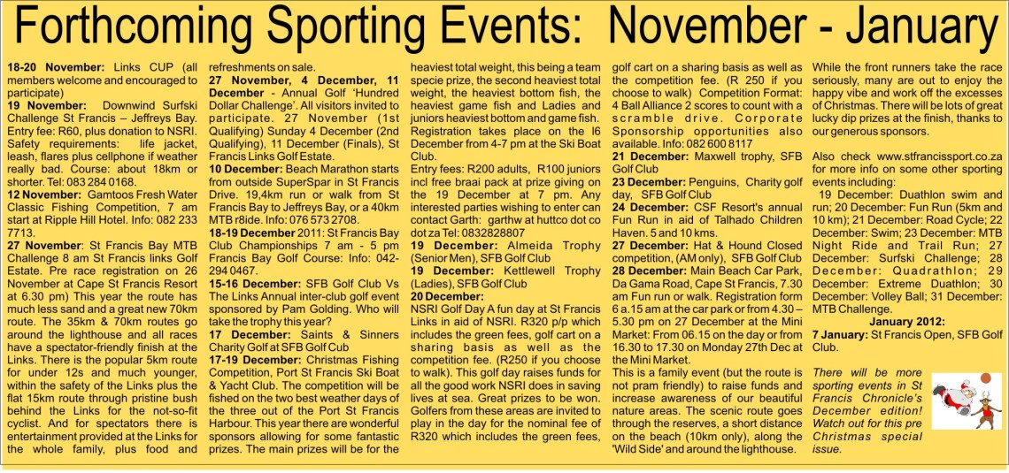Please send any forthcoming events in St Francis (not already listed here) to St Francis Chronicle – for inclusion in our exciting , bumper Christmas edition and bigger, better selection of events. Yoy can add your forthcoming event here too – in the ‘Comment’ section below.