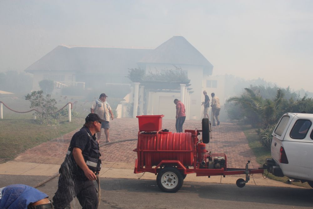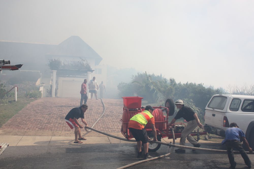 NSRI and other emergency personnel started wetting the roofs of the thatched houses with fire engine hosepipes to prevent them catching alight – a practice quickly repeated by other neighbours themselves at their homes.