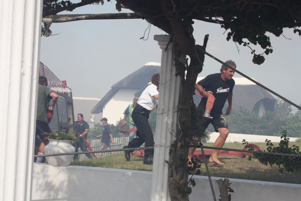 The fire occurred at about 2.30 pm and Kouga emergency services personnel, including the St Francis Bay fire station crew headed up by Keith Donaldson, plus NSRI and St Francis Links volunteers with their water tanks and hosepipes, raced to the scene and battled for hours to extinguish the spreading flames..