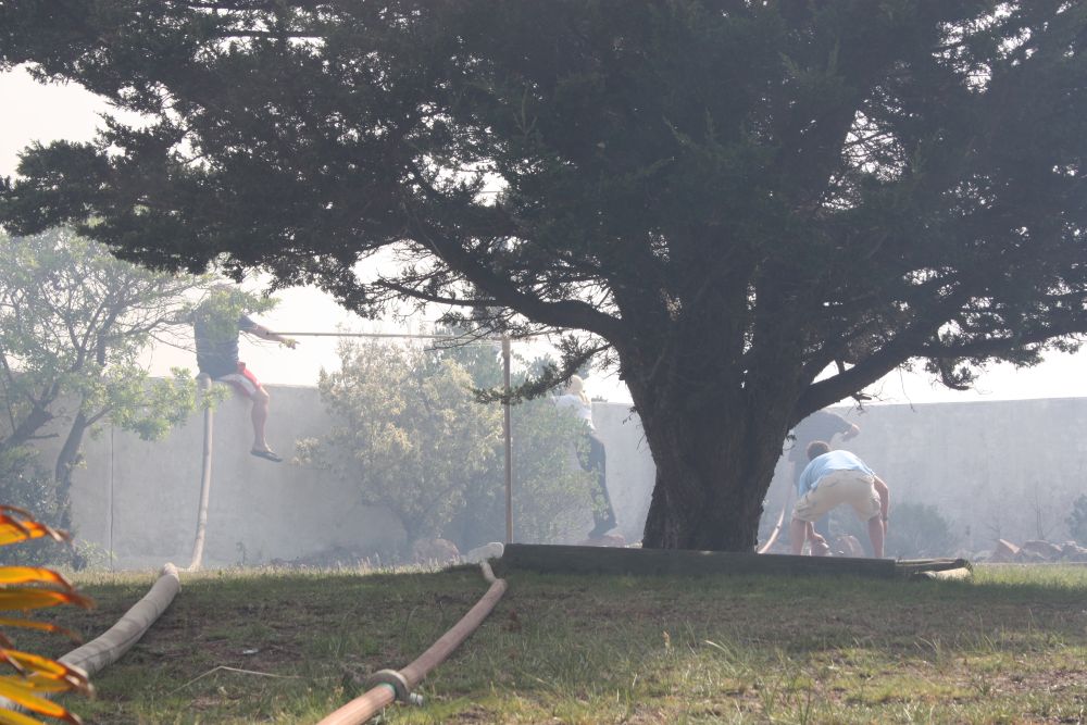 For a while it appeared as if the fire had been brought under control but around 4 pm the fiercer wind carried sparks which landed on Martha’s roof and then jumped the road and landed on the roof of another house. Both fires were quickly extinguished but the air was filled with black acrid smoke and it was difficult breathe at one point.