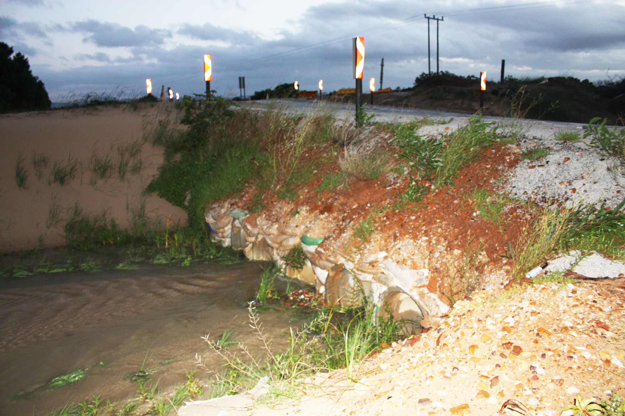 As these photos taken early this morning show, the bridge is still in remarkably good condition.  However, on the Kromme River side the bank above the outflow pipes is severely eroded at the Humansdorp end threatening the tarred road at that point. Repairs and sand nourishment here are needed before further storms, observers point out.