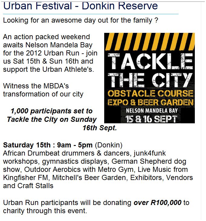 An action packed weekend is planned for those participating in or attending the 2012 Urban Run organised by ZSports from 15-16 September that starts from Donkin Reserve. To enter call: