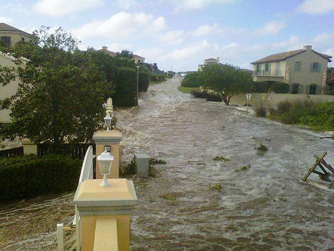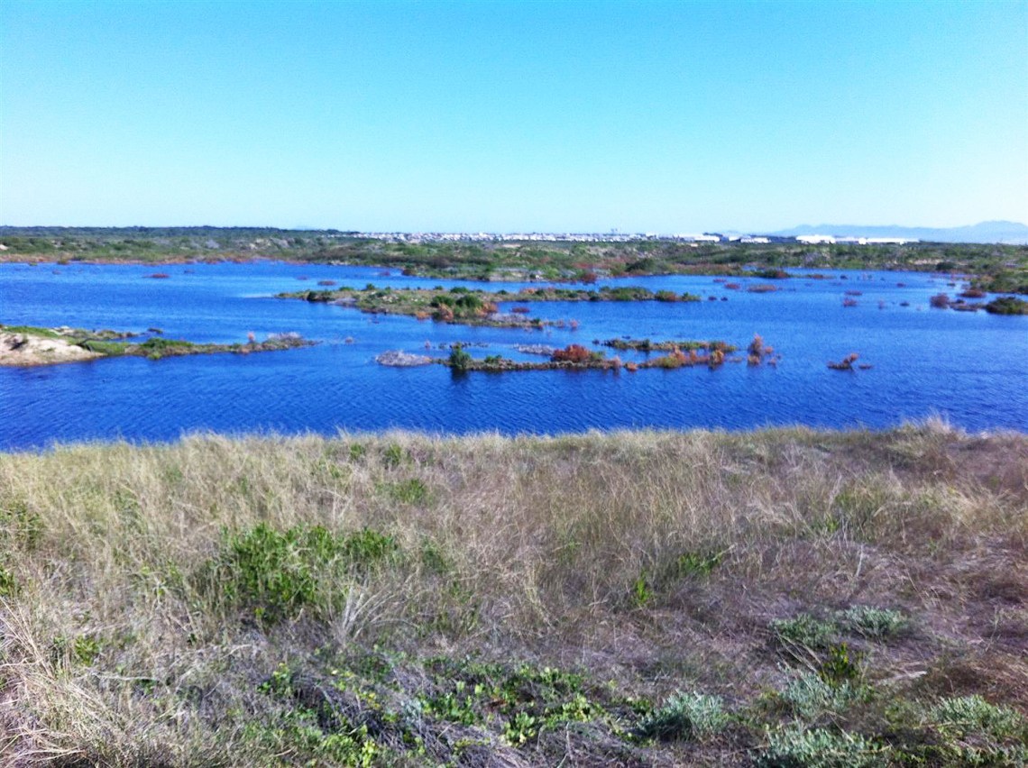 15 September 2012: A river of debris flows down the quiet, upmarket street,namely Tom Brown Boulevard, in Santareme causing mayhem in its wake. This photo is taken from near the gate of Paddy Oosthuizen’s house, one of the homes damaged in the flood of debris, This photo was also snapped just before the wall of Mike Denbury’s holiday home, next to that of Paddy, (one up on the left,) was washed away by the flood. The water and debris smashed windows and ploughed through the whole house in its bid to reach the sea , ruining the interior and much of the exterior. Photo: Ryan FynnThe source of the flood: Another photo of the big lake, aka dam, that is hidden among the Santareme dunes and that has piqued the interest of many. This dam in no immediate danger of flooding the houses of Santareme nor of breaching according to experts who visited the dam yesterday. The water is going to be slowly siphoned out to take pressure off the walls. Photo: Jan Botha