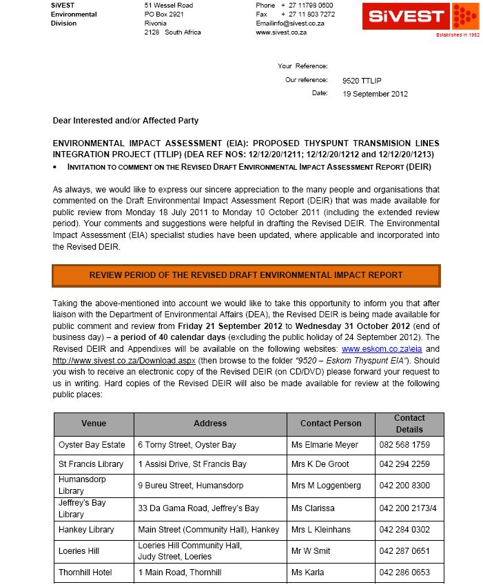 SiVEST, the consultants for the Thyspunt Transmission Lines, advise that following liaison with the Department of Environmental Affairs (DEA), the Revised DEIR (Draft Environmental Impact Report) is being made available for public comment and review from today Friday 21 September 2012 to Wednesday 31 October 2012 (end of business day) – a period of 40 calendar days (excluding the public holiday of 24 September 2012) at the venues listed below (on the photo: For St Francis residents the documents can be viewed at the pubic library in Assisi Drive, next to Kouga Municipality satellite offices: