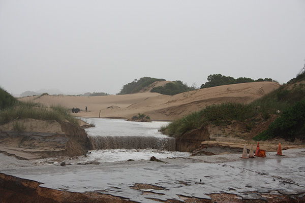 This huge chasm, or more accurately The Sand River Canyon, has effectively marooned St Francis residents and visitors here this weekend of 20 October 2012. In the background on the Humansdorp side of the bridge, a Sand Waterfall – a new development on the sand dunes – could be seen this morning.