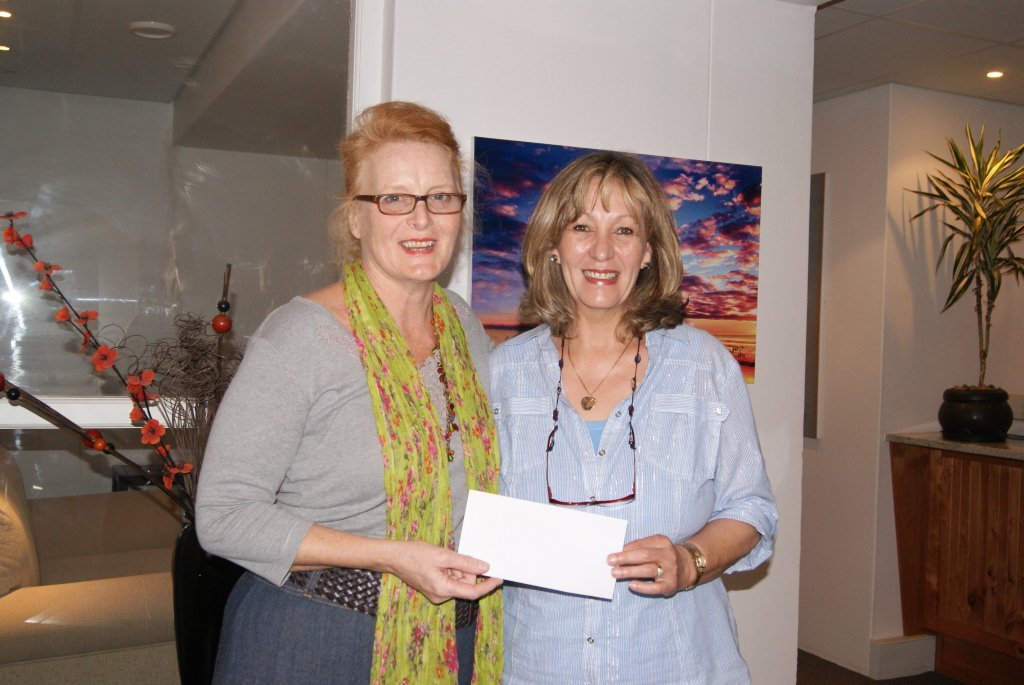 A delighted Jenny Suter, chairperson of St Francis Bay Community Home Care accepted a cheque for R750 from Enid Pretorius.