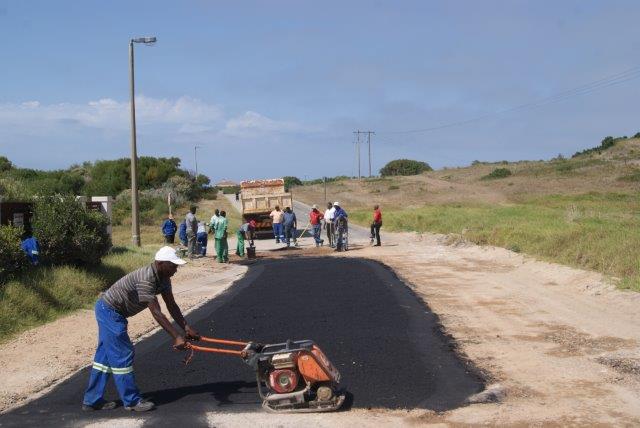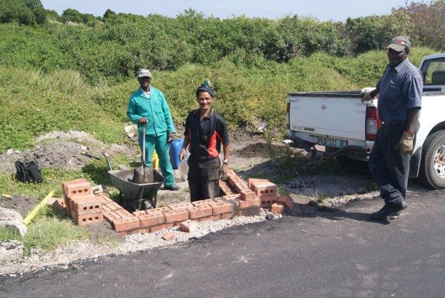 Municipal road repairers started from the Port end of St Francis Drive. The section closest to the turn off to the Port is now complete and they are busy bricking either side of the drainage pipes installed last year.