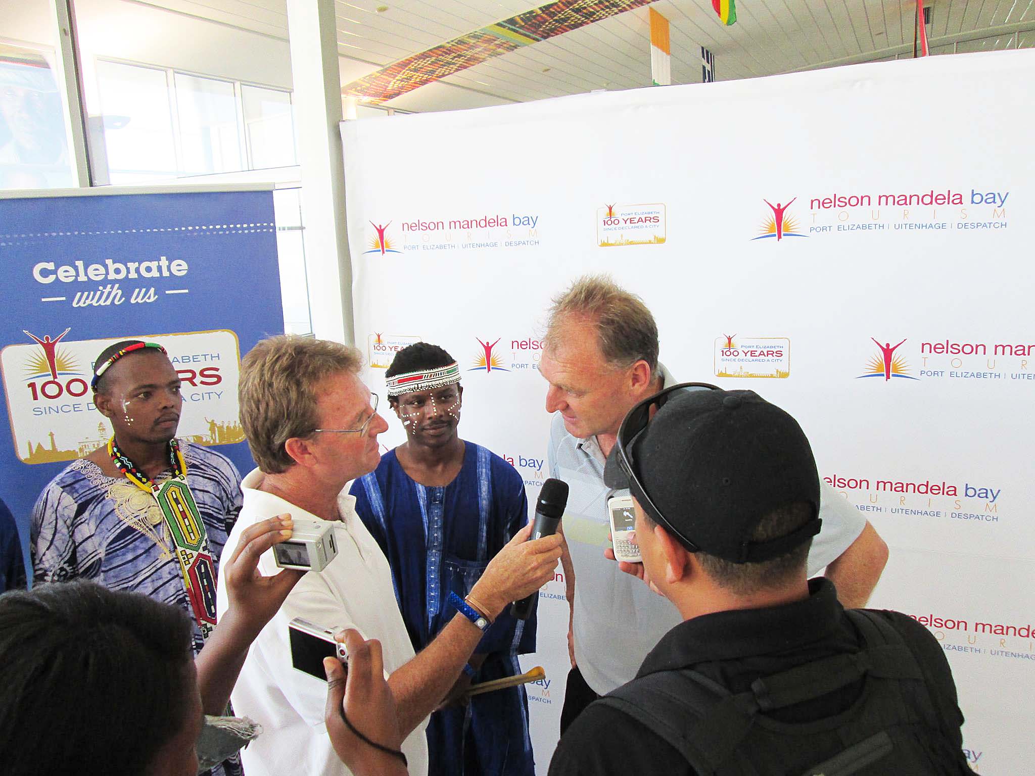 The Australian cricket team and the South African Protea’s arrival at Port Elizabeth airport today was captured by African Drumbeat dancers and musicians who welcomed them .