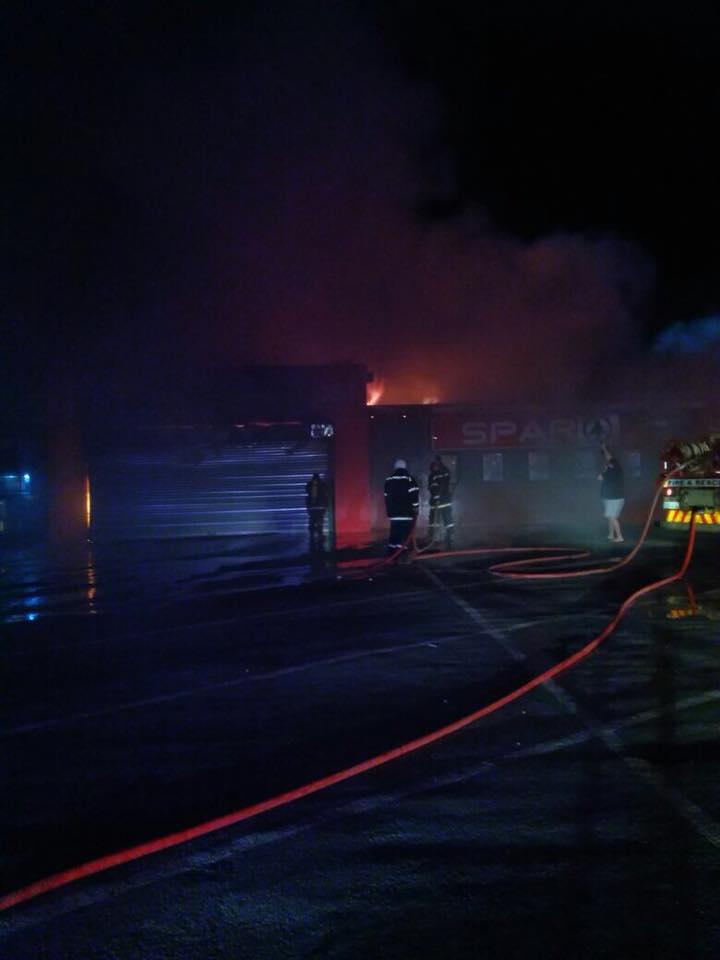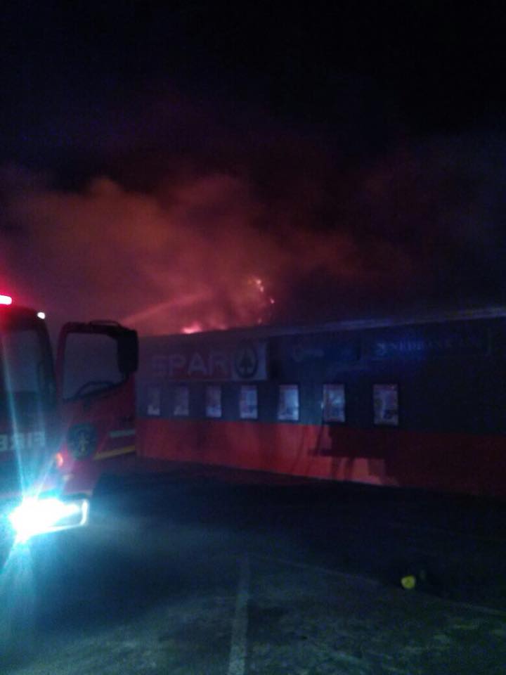 Tops liquor store was burnt down last night, 20 October, but the main retail Spar store alongside, although damaged, was saved by firemen.