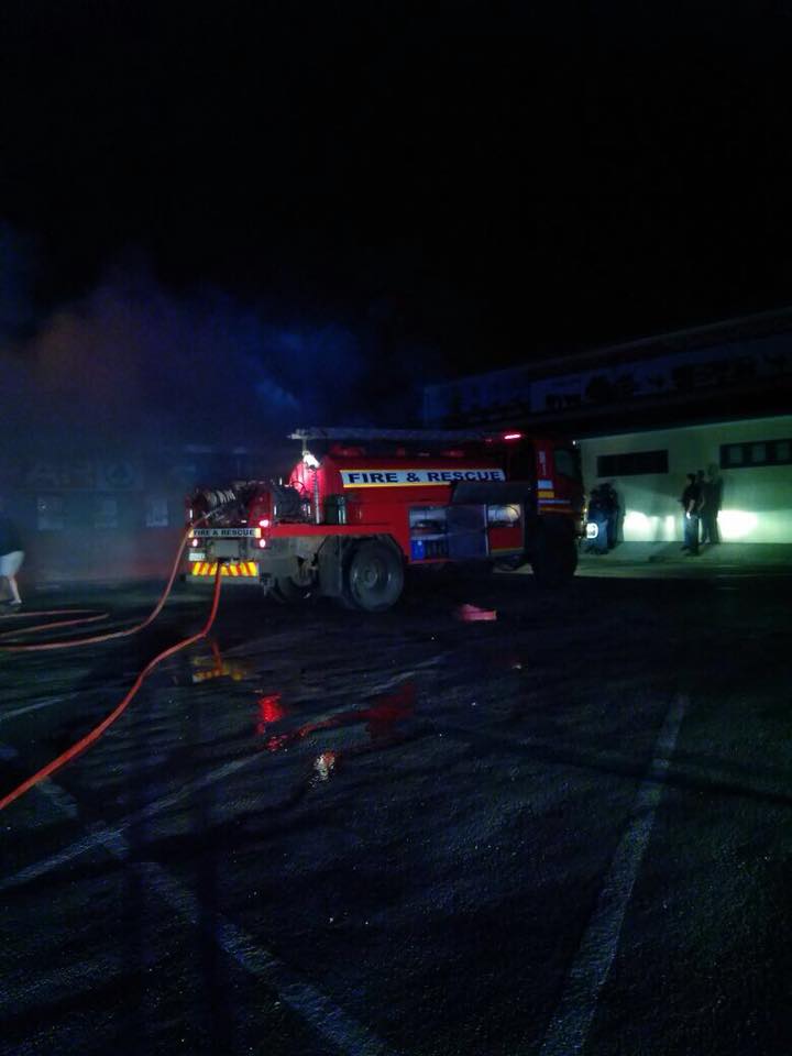 According to Carl Trahms, who was at the fire scene, the Kouga fire brigade was busy at an accident in Jeffreys Bay at the time the fire started and had to race through to Humansdorp when alerted by the fire.