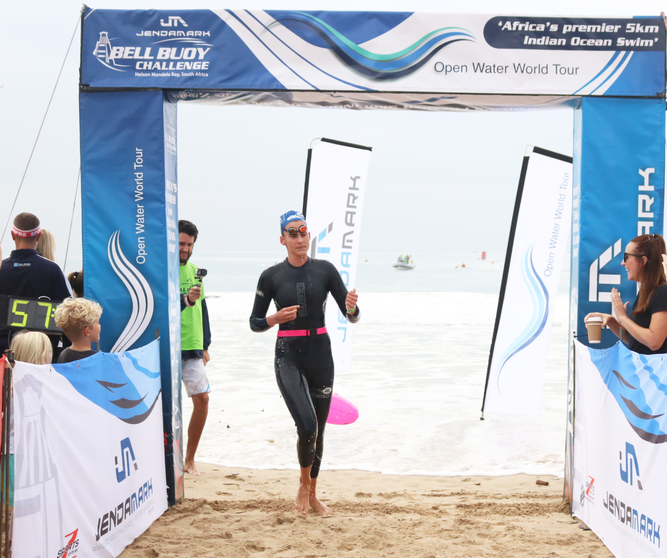 Overall champion, Amica de Jager, from Cape St Francis crosses the line in a fast 57:42 to lead the Open Water World Tour rankings.