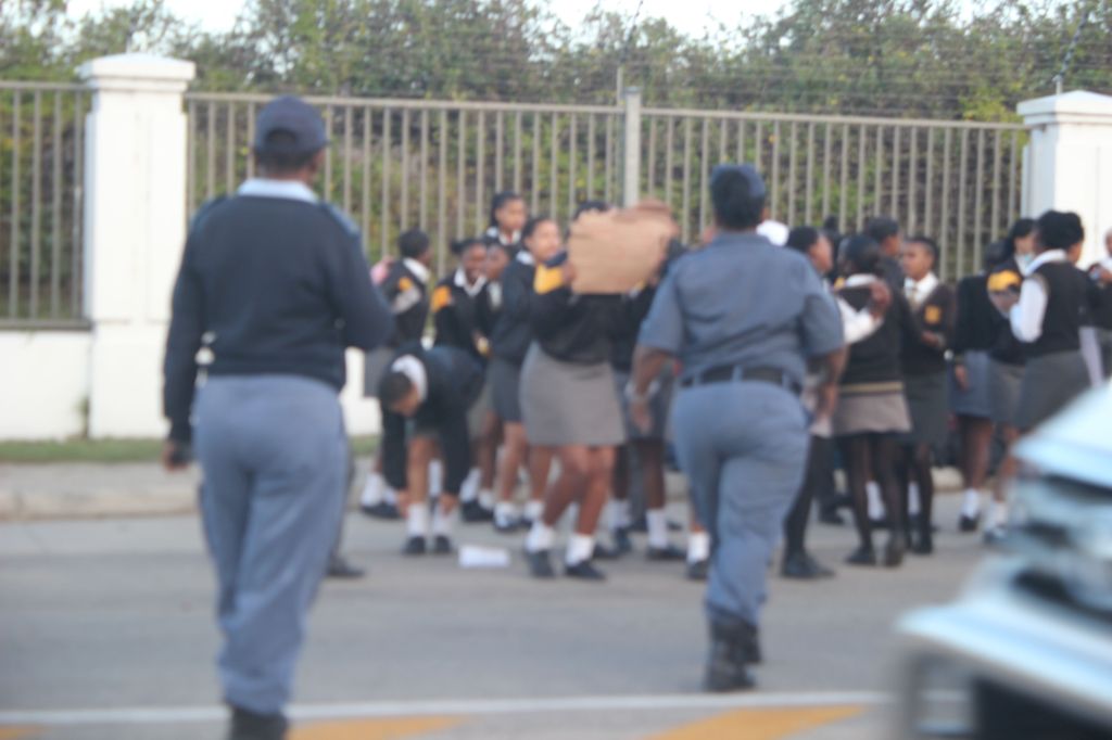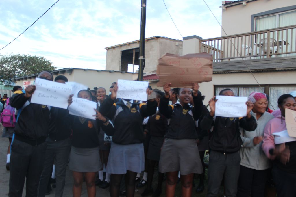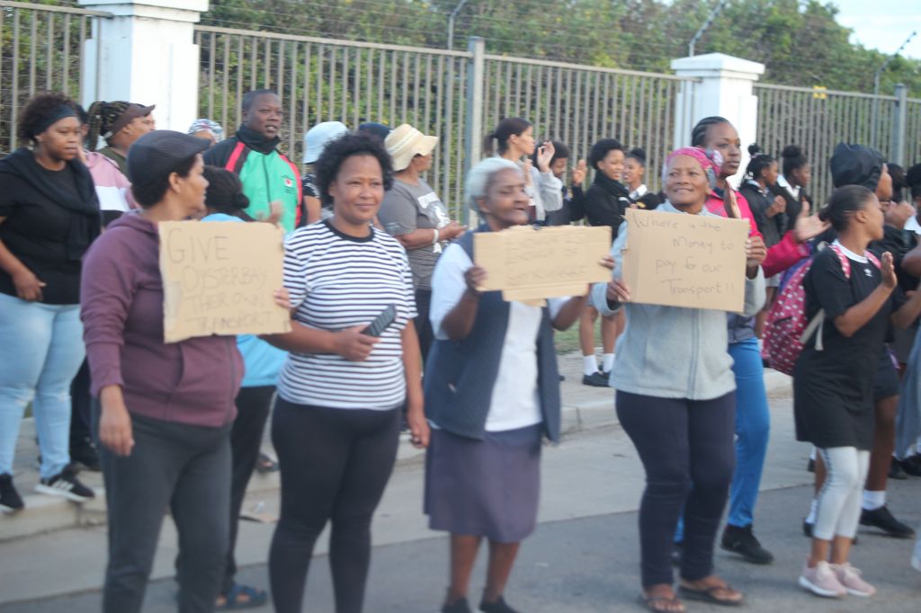 High school kids and their Moms took to the streets this morning and marched from the taxi rank to the traffic circle in protest at the lack of transport to high schools in Humansdorp for the past two and half weeks, and they demanded transport.