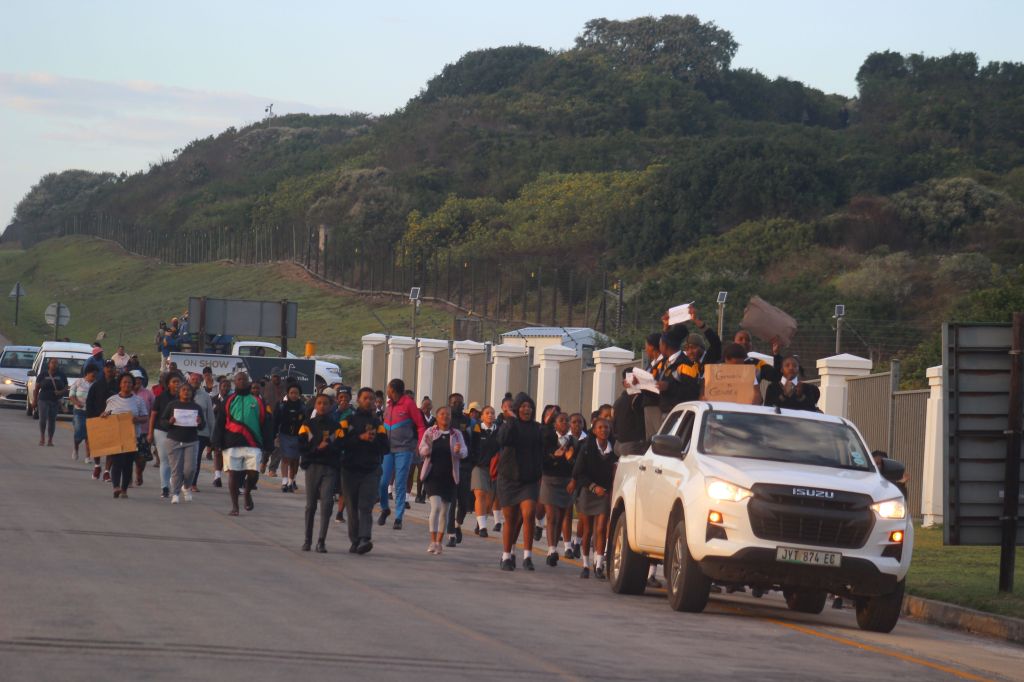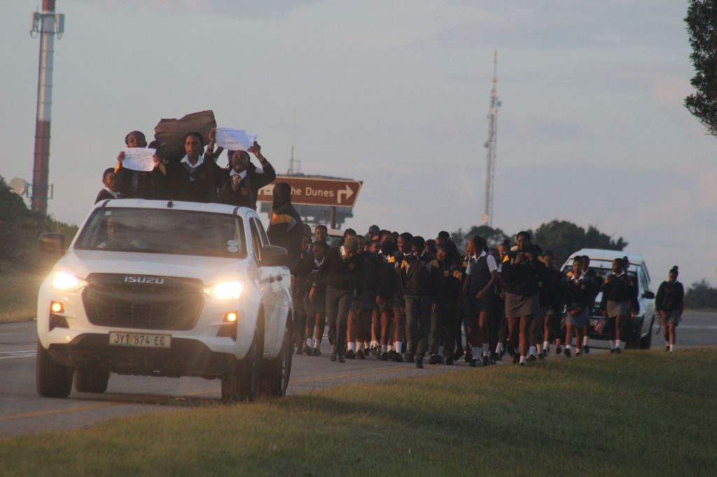 The group marched cheerfully. singing songs and waving banners and kept to the complete left of the R330 from Sea Vista to the traffic circle,