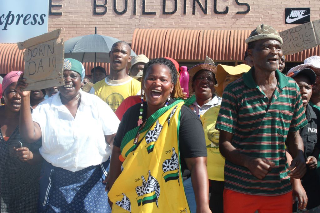 Most marchers, dressed in bright and gay ANC colours and outfits, stood in a long line on the edge of the street, singing and dancing for almost an hour. They then moved round the corner and sat on the pavement in front of the municipal gates while one of their leaders, clr Phumzile Oliphant, addressed the crowd before handing over to ANC Branch Secretary Mfundiso Oliphant, who also spoke and then gave the memorandum to Bornman to sign.