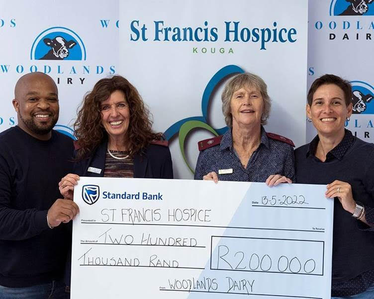 Photyo credit Woodands. Mandla Charli left) and Marisa Maccaferri (far right) of Woodlands Dairy handed over the cheque to Sister Ingrid Williams and her colleague Sharon Von Mollendorff of St. Francis Hospice after last year’s golf day.