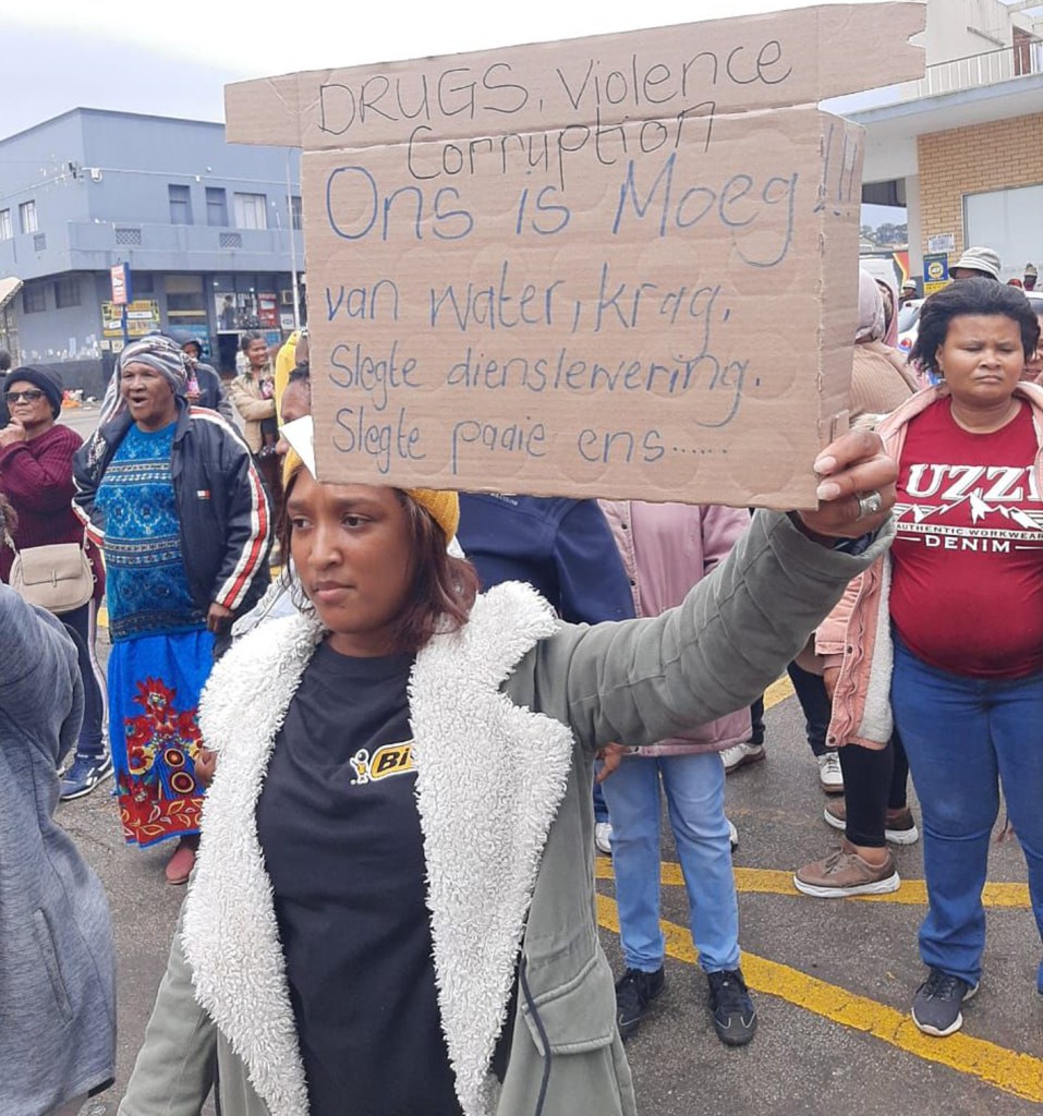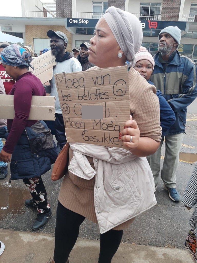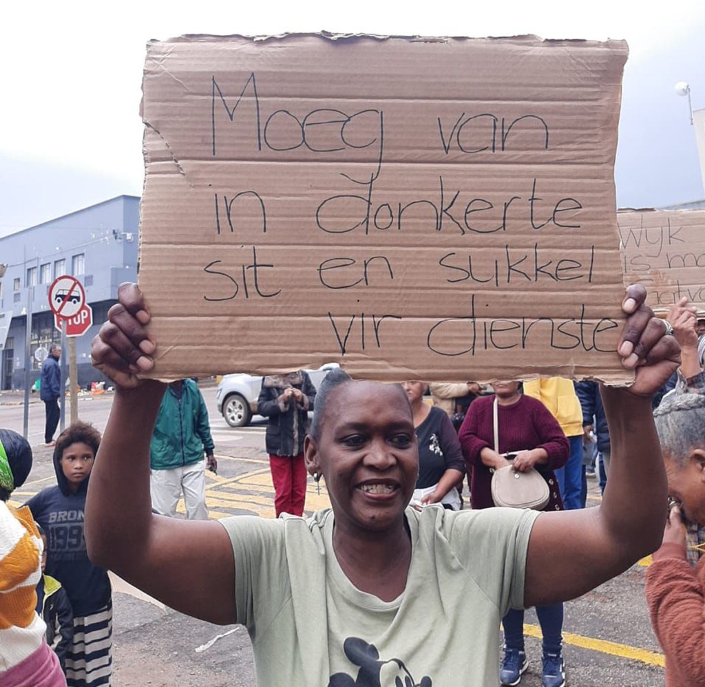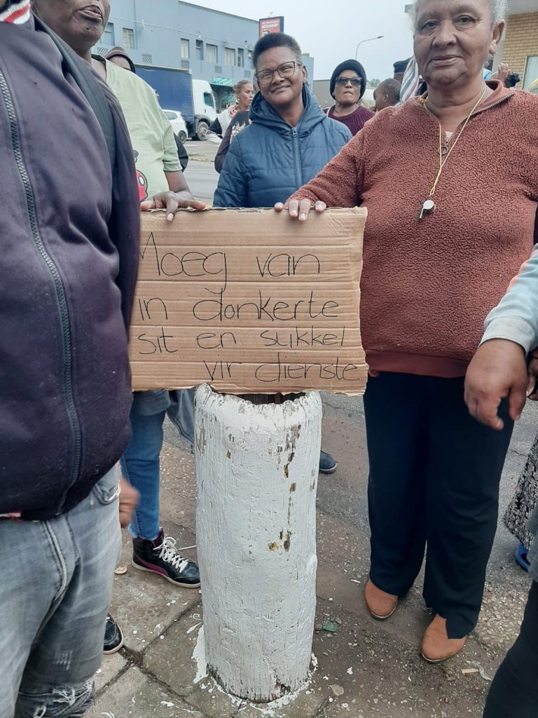 Placards in Afrikaans with phrases of ‘Tired of empty promises’, ‘We are fed up’, ‘Tired of sitting in the dark and struggling for services,’ were waved around.