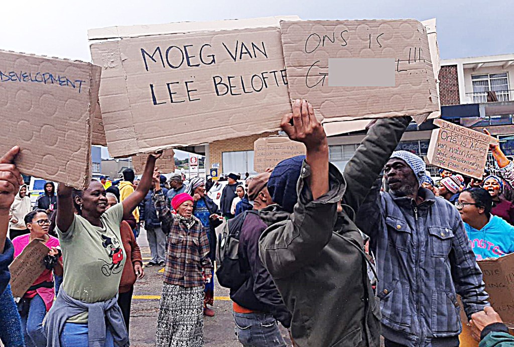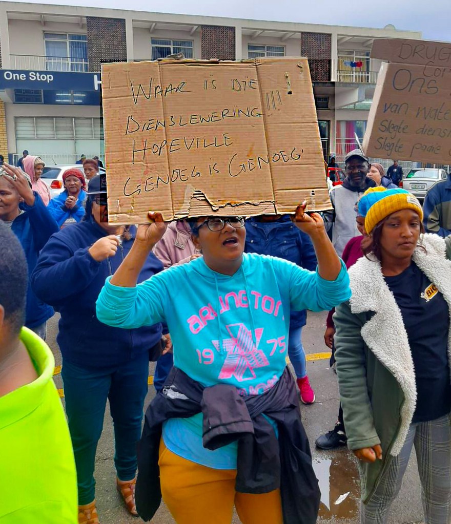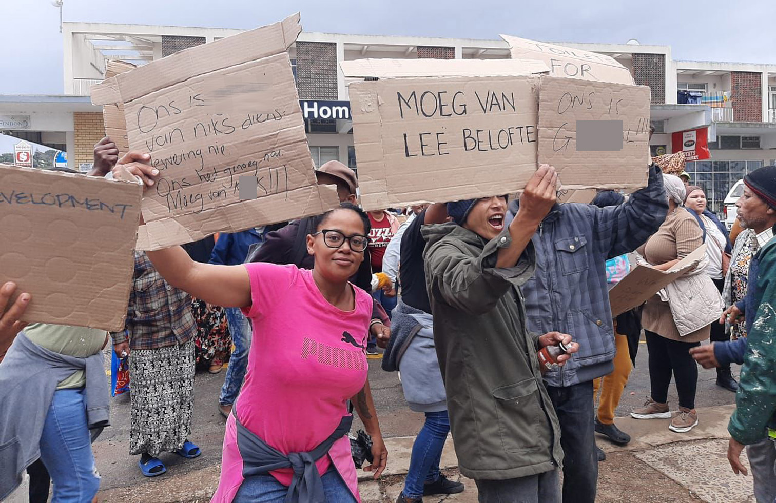 Placards in Afrikaans with phrases of ‘Tired of empty promises’, ‘We are fed up’, ‘Tired of sitting in the dark and struggling for services,’ were waved around.