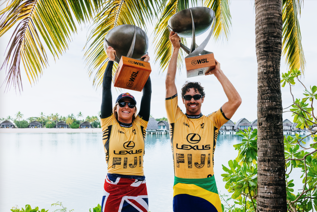 WSL 2025 winners, Molly Picklum of Australia & Yago Dora of Brazil, after winning the 2025 World Title at the Lexus WS – Photo Cate Miers